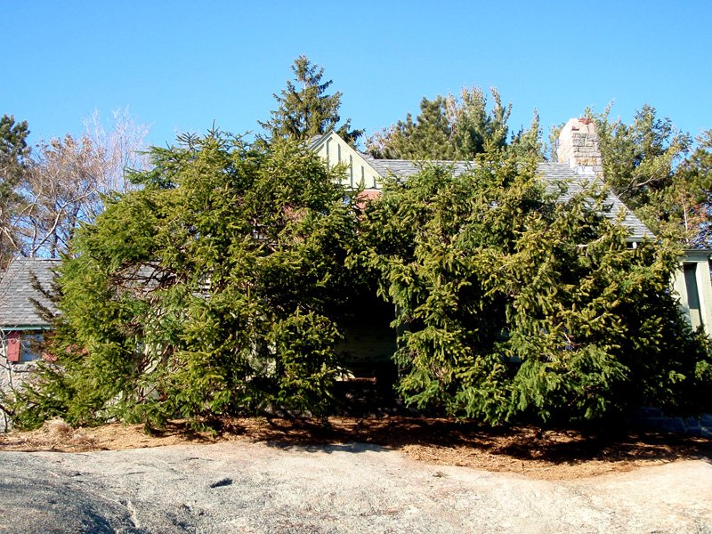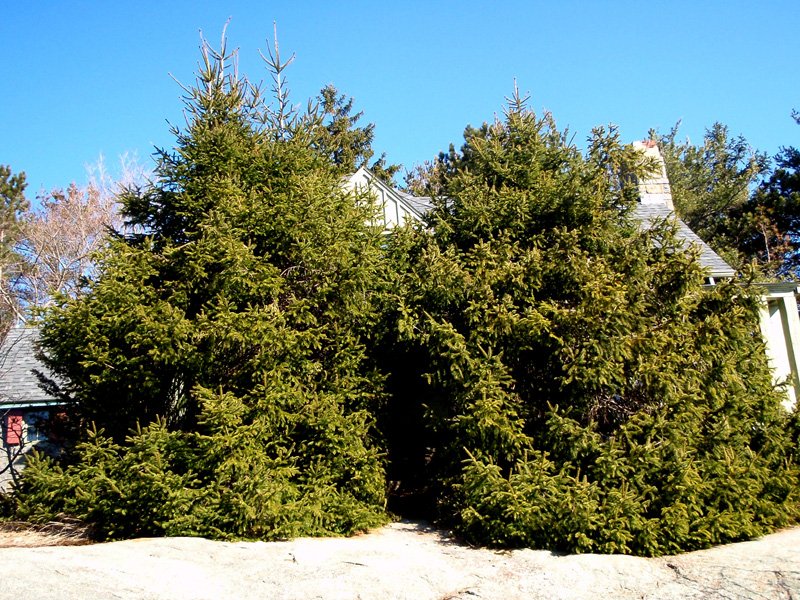 | For this job, we cleaned up these seriously overgrown spruces. We thinned them out and pruned the dead limbs to restore access to the house, provide light to the inner branches as well as the house, shape them and aid them in their growth and overall health. |